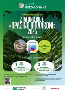 Από την 6η Απριλίου έως και τις 10 Μαΐου 2026, ενήλικες κάτοικοι του Δήμου Θεσσαλονίκης μπορούν να δηλώσουν συμμετοχή ηλεκτρονικά στην ιστοσελίδα www.thessaloniki.gr/prasinobalkoni, υποβάλλοντας φωτογραφίες των πράσινων δημιουργιών τους σε μπαλκόνια ή ταράτσες.