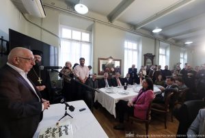 Ο Πρόεδρος της Βουλής ευχαρίστησε τη Διοίκηση για την πρόσκληση, τονίζοντας ότι η παρουσία του στο Γηροκομείο Αθηνών αποτελεί για τον ίδιο μια ιδιαίτερα συγκινητική στιγμή. Αναφέρθηκε στη συλλογική προσπάθεια που καταβλήθηκε τα προηγούμενα χρόνια με αποτέλεσμα «αυτό το μικρό θαύμα της οικονομικής εξυγίανσης του Ιδρύματος».