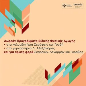 Για μία ακόμη χρονιά, παιδιά, έφηβοι και ενήλικες με αναπηρία έχουν τη δυνατότητα να συμμετέχουν δωρεάν σε ειδικά δομημένα προγράμματα κολύμβησης και άσκησης, από τη Γενική Γραμματεία Αθλητισμού στα κολυμβητήρια & τα γυμναστήρια του Δήμου Αθηναίων, σχεδιασμένα και υλοποιημένα από εξειδικευμένους Πτυχιούχους Φυσικής Αγωγής.