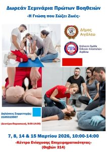 Ο Δήμος Αιγάλεω, μέσω της Διεύθυνσης Κοινωνικής Προστασίας, σε συνεργασία με την Επίλεκτη Ομάδα Ειδικών Αποστολών (ΕΠΟΜΕΑ), προσκαλεί τους πολίτες να συμμετάσχουν σε Σεμινάρια Πρώτων Βοηθειών, ενισχύοντας την κοινωνική ασφάλεια και την ετοιμότητα της κοινότητας.