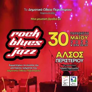 Ο Δήμος Περιστερίου, προσκαλεί όλους τους δημότες και φίλους της μουσικής να απολαύσουν μια συναυλία αφιερωμένη στα μουσικά είδη rock, blues και jazz.