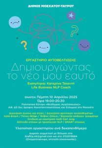 Το εργαστήριο θα πραγματοποιηθεί με την καθοδήγηση της Κατερίνας Τσιαντή, Life Business NLP Coach και έχει σχεδιαστεί για να βοηθήσει τους συμμετέχοντες στη διαχείριση του άγχους, των αρνητικών συναισθημάτων και των εσωτερικών περιορισμών που εμποδίζουν την προσωπική εξέλιξη.
