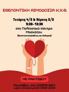Η εθελοντική αιμοδοσία θα διεξαχθεί την Τετάρτη 4 και την Πέμπτη 5 Φεβρουαρίου , από τις 09.30 έως τη 13.30 στο Πολιτιστικό Κέντρο «Θεόδωρος Αγγελόπουλος» στο Μοσχάτο (Κωνσταντινουπόλεως και Σολωμού). Το αίμα που θα συγκεντρωθεί θα ενισχύσει την τράπεζα αίματος του Δήμου Μοσχάτου-Ταύρου.