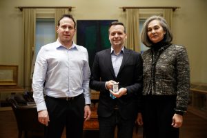Η πρόεδρος του ΣΕΓΑΣ, Σοφία Σακοράφα παρέδωσε στον κ. Δούκα το συλλεκτικό μετάλλιο των 40 χρόνων του Αυθεντικού Μαραθωνίου και τον ιματισμό της εθνικής ομάδας στίβου.