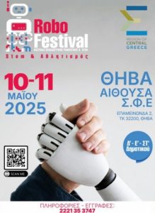 Η Περιφέρεια Στερεάς Ελλάδας διοργανώνει στην Θήβα το Φεστιβάλ Εκπαιδευτικής Ρομποτικής RoboFestival – Robotics – Coding – Engineering – Maths με θέμα τις STEM (Science-Technology-Engineering-Mathematics) & Αθλητισμός.