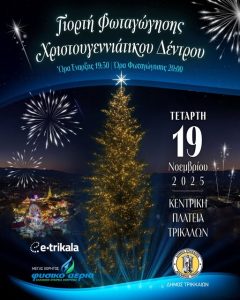 Το απόγευμα της Τετάρτης 19 Νοεμβρίου τα Τρίκαλα, τα χωριά, ολόκληρη η περιοχή, εισέρχονται στην εορταστική περίοδο των Χριστουγέννων, καθώς ο Δήμος Τρικκαίων φωταγωγεί το χριστουγεννιάτικο δέντρο!