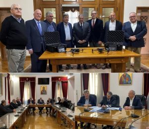 Δύο υπερσύγχρονα μη Επανδρωμένα Αεροχήματα (drones) παρέδωσαν τα μέλη του Διοικητικού Συμβουλίου του Εμπορικού και Βιομηχανικού Επιμελητηρίου Πειραιώς (Ε.Β.Ε.Π.) στους Δημάρχους Ασπροπύργου και Μεγάρων, στο πλαίσιο ειδικής τελετής, που έλαβε χώρα στο Ε.Β.Ε.Π. Τα δύο drones θα χρησιμοποιηθούν από εκπαιδευμένα στελέχη της Δημοτικής Αστυνομίας, με στόχο να συμβάλουν καθοριστικά στην ενίσχυση δράσεων πολιτικής προστασίας, ελέγχου και πάταξης του παραεμπορίου και λαθρεμπορίου, στην ευρύτερη περιοχή των δύο Δήμων.