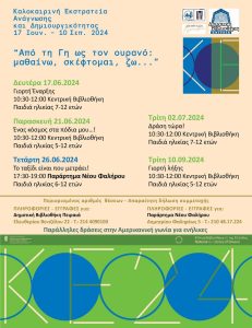 Σε ένα συναρπαστικό ταξίδι αναζήτησης, με σύνθημα: «Από τη Γη ως τον ουρανό: μαθαίνω, σκέφτομαι, ζω…», οι μικροί Πειραιώτες θα έχουν την ευκαιρία να συμμετάσχουν δωρεάν σε δράσεις με διαφορετικές θεματικές, έως και την Τρίτη 10 Σεπτεμβρίου 2024.