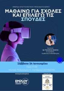 Η ημερίδα θα πραγματοποιηθεί το Σάββατο 24 Ιανουαρίου στις 17:00, στο Πνευματικό Κέντρο «Κ. Χατζάκος», στα Κουφάλια με κεντρικό ομιλητή τον Δρ Χρήστο Ταουσάνη, συγγραφέα και σύμβουλο σταδιοδρομίας, έναν από τους πλέον έμπειρους και αναγνωρισμένους ομιλητές στον χώρο του επαγγελματικού προσανατολισμού σε πανευρωπαϊκό επίπεδο.