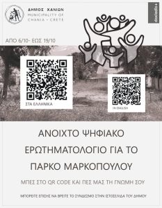 Ο Δήμος Χανίων, σε συνεργασία με το γραφείο doxiadis+ έχει μπει στη δεύτερη φάση συμμετοχικού σχεδιασμού για το Πάρκο Μαρκοπούλου. Στόχος είναι η διαμόρφωση ενός σύγχρονου, βιώσιμου και ανοιχτού πάρκου, με τη συμβολή των πολιτών και των φορέων της πόλης.