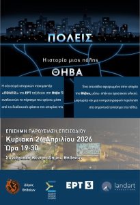 Η νέα σειρά ιστορικών ντοκιμαντέρ ΠΟΛΕΙΣ της ΕΡΤ ταξιδεύει στη Θήβα και αναδεικνύει το πέρασμα του χρόνου μέσα από τις διαδοχικές φάσεις της ιστορίας της. Η επίσημη πρεμιέρα του ντοκιμαντέρ θα πραγματοποιηθεί την Κυριακή 26 Απριλίου στις 19.30, στον Συνεδριακό Κέντρο Δήμου Θηβαίων. Μπορείτε να παρακολουθήσετε το επεισόδιο στο κανάλι της ΕΡΤ3 την Τετάρτη 30 Απριλίου στις 8 το βράδυ.