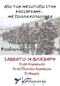 Το Σάββατο 14/2 στις 12:00, εκκινώντας από το Δημαρχείο Καισαριανής, οι Κουδουνάτοι από τον Σύλλογο των Απανταχού Μεσοτοπιτών Λέσβου «Η Αναγέννηση», συνοδευόμενοι από μέλη συλλόγων της πόλης μας, προαναγγέλλουν τον ερχομό της άνοιξης και την αναγέννηση της φύσης, προκαλώντας θόρυβο με τις κουδούνες τους.