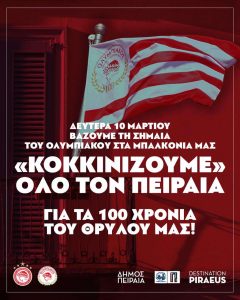Ο Δήμος Πειραιά, συμμετέχοντας στον μεγάλο εορτασμό για τα 100 χρόνια από την ίδρυση του Ολυμπιακού, διοργανώνει εντυπωσιακές εορταστικές δράσεις που θα πλημμυρίσουν την πόλη με ερυθρόλευκο χρώμα.