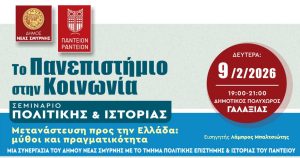 Τα σεμινάρια θα πραγματοποιούνται μέχρι τις 23 Μαρτίου 2026 κάθε Δευτέρα, 19:00-21:00, στον Δημοτικό Πολυχώρο “Γαλαξίας” και οι δημότες θα έχουν την ευκαιρία να παρακολουθούν δωρεάν διαλέξεις από καταξιωμένους Καθηγητές του Παντείου για θέματα που απασχολούν την δημόσια σφαίρα.