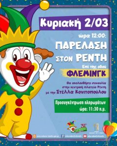 Την Κυριακή 2 Μαρτίου στις 12.00 μ.μ. θα πραγματοποιηθεί η μεγάλη Καρναβαλική Παρέλαση επί της οδού Φλέμινγκ (προσυγκέντρωση πληρωμάτων 11.30 π.μ.). Οι δρόμοι της πόλης θα γεμίσουν χρώμα, χαμόγελα και εντυπωσιακά άρματα σε ένα φαντασμαγορικό αποκριάτικο θέαμα. Μετά τη λήξη της παρέλασης ακολουθεί μεγάλη συναυλία στην κεντρική πλατεία Ρέντη με τη Στέλλα Κονιτοπούλου με νησιώτικες και παραδοσιακές μελωδίες.