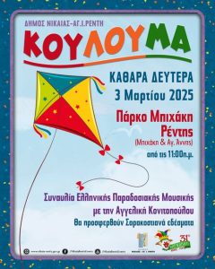 «Καλωσορίζουμε τον Μάρτη με την αποκριάτικη εκδήλωση για τα παιδιά, το Σάββατο 1η Μαρτίου στην κεντρική πλατεία Ρέντη. Την επόμενη μέρα, Κυριακή 2 Μαρτίου θα πραγματοποιηθεί η Καρναβαλική Παρέλαση με τη συμμετοχή 5.000 μικρών και μεγάλων καρναβαλιστών, 15 αρμάτων και θα ακολουθήσει συναυλία της Στέλλας Κονιτοπούλου στην κεντρική πλατεία Ρέντη. Φέτος γιορτάζουμε τα Κούλουμα στο πάρκο Μπιχάκη και θα υποδεχθούμε τη Σαρακοστή με τον πιο όμορφο και παραδοσιακό τρόπο, με Σαρακοστιανά εδέσματα για όλους, ζωντανή ελληνική μουσική και την Αγγελική Κονιτοπούλου που θα μας ταξιδέψει στον κόσμο της παράδοσης με τα τραγούδια της. Σας περιμένουμε όλους να γιορτάσουμε μαζί αυτό το αποκριάτικο τριήμερο».
