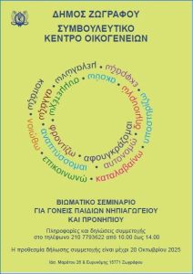 Το Συμβουλευτικό Κέντρο Οικογενειών του Δήμου Ζωγράφου στο πλαίσιο της συνεργασίας του με τα νηπιαγωγεία, σχεδιάζει, οργανώνει και υλοποιεί για ακόμα μια χρονιά Βιωματικό Σεμινάριο για γονείς που έχουν παιδιά στο νηπιαγωγείο και στο προνήπιο.