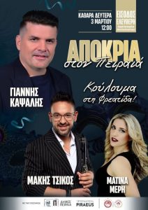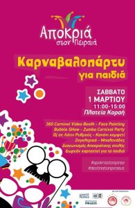 Με ένα μεγάλο ξέφρενο καρναβαλοπάρτι, συνεχίζονται οι αποκριάτικες εκδηλώσεις του Δήμου Πειραιά, το Σάββατο 1 Μαρτίου, από τις 11:00 έως τις 15:00, στην πλατεία Κοραή, όπου μικροί και μεγάλοι θα διασκεδάσουν σε μια γιορτή γεμάτη χρώματα, χαμόγελα, μουσική, παιχνίδια και εντυπωσιακά δρώμενα.