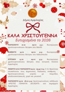 Ο Δήμος Αμφιλοχίας υποδέχεται και φέτος τα Χριστούγεννα με ένα πλούσιο εορταστικό πρόγραμμα, γεμάτο μουσική, χορό και δραστηριότητες για παιδιά, καθώς και με τις καθιερωμένες φωταγωγήσεις των χριστουγεννιάτικων δέντρων στις Δημοτικές Ενότητες Αμφιλοχίας, Ινάχου και Μενιδίου.